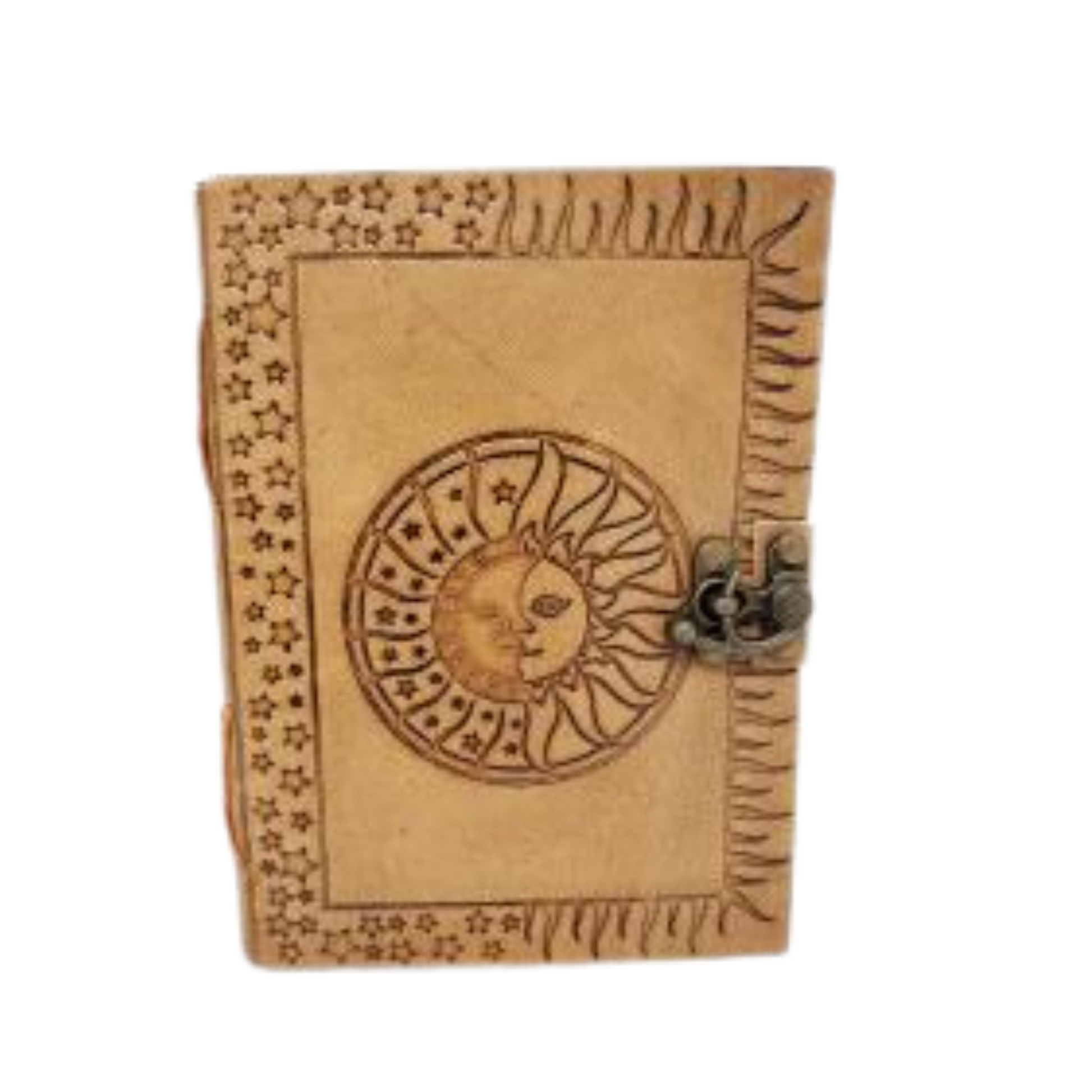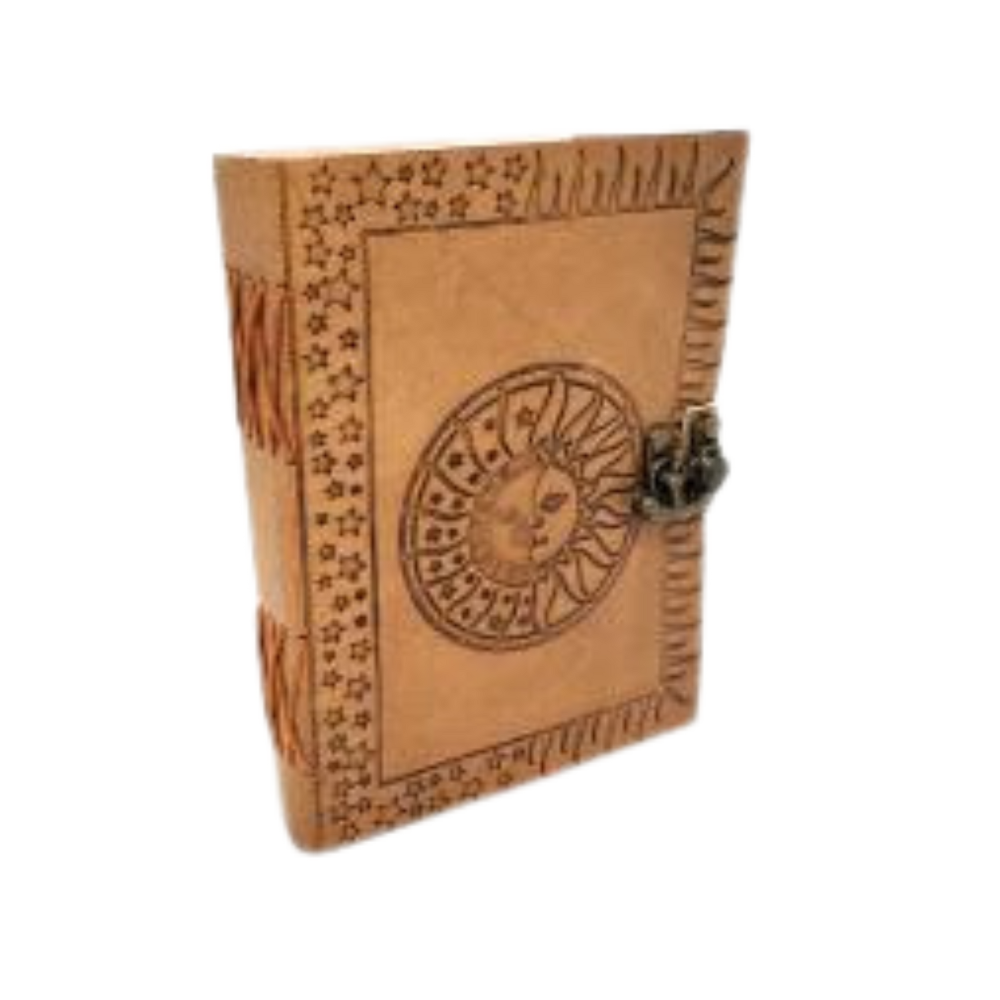 Celestial embossed leather journal/ grimoire, 5x7", containing around 192 hand made paper closes with latch.