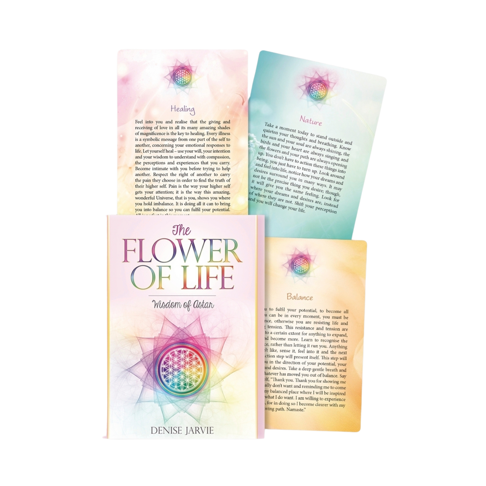 The Flower of Life contains all possibilities, the essence of all desire. The flower is a powerful creative symbol that holds infinite divine potential. These cards are a portal to the potential that exists deep within you. Take a journey with the divine Astar, a loving consciousness whose energy permeates this deck. Through the Flower of Life cards, the love and truth that exists inside us all streams to the surface and blossoms in the world.